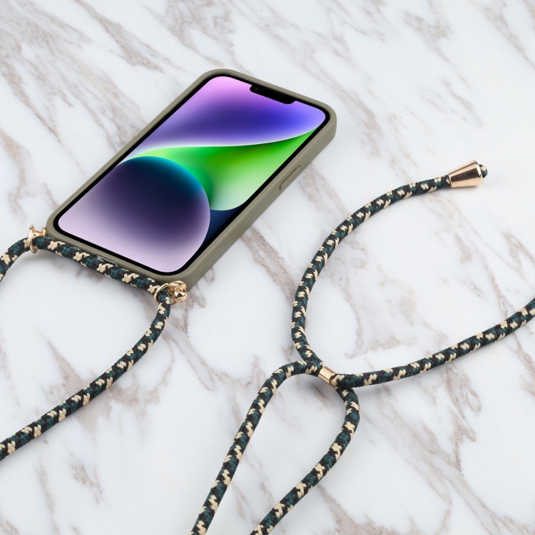 Caja teléfono iPhone 15 Plus TPU Paja de Trigo a prueba de golpes con cordón para cuello (Verde Oscuro)