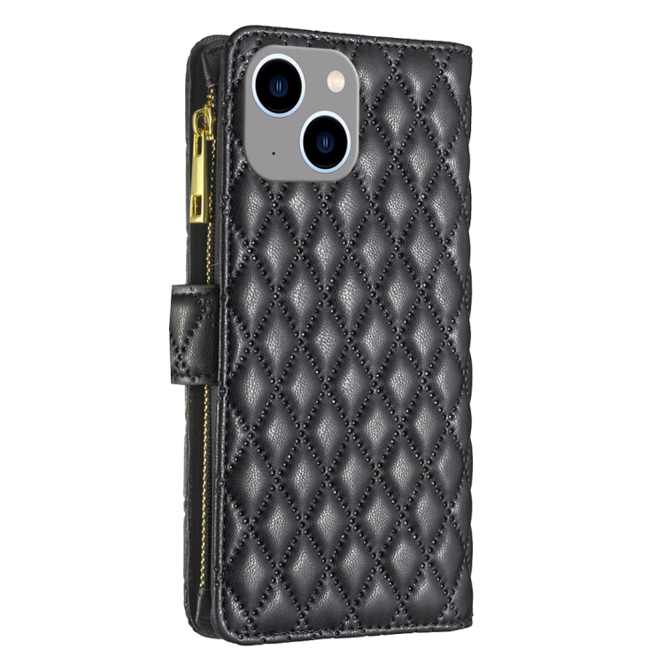 Funda para iPhone 15 Plus Diamond Lattice Zipper Wallet de Cuero con Tapa (Negro)