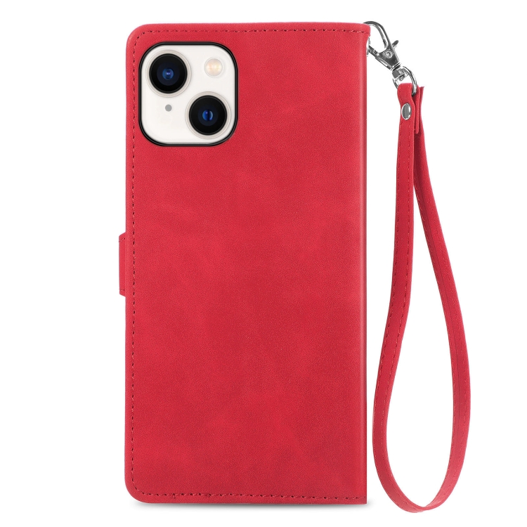 Estuche para Teléfono iPhone 15 Plus Cuero con Cremallera y Flores en Relieve (Rojo)
