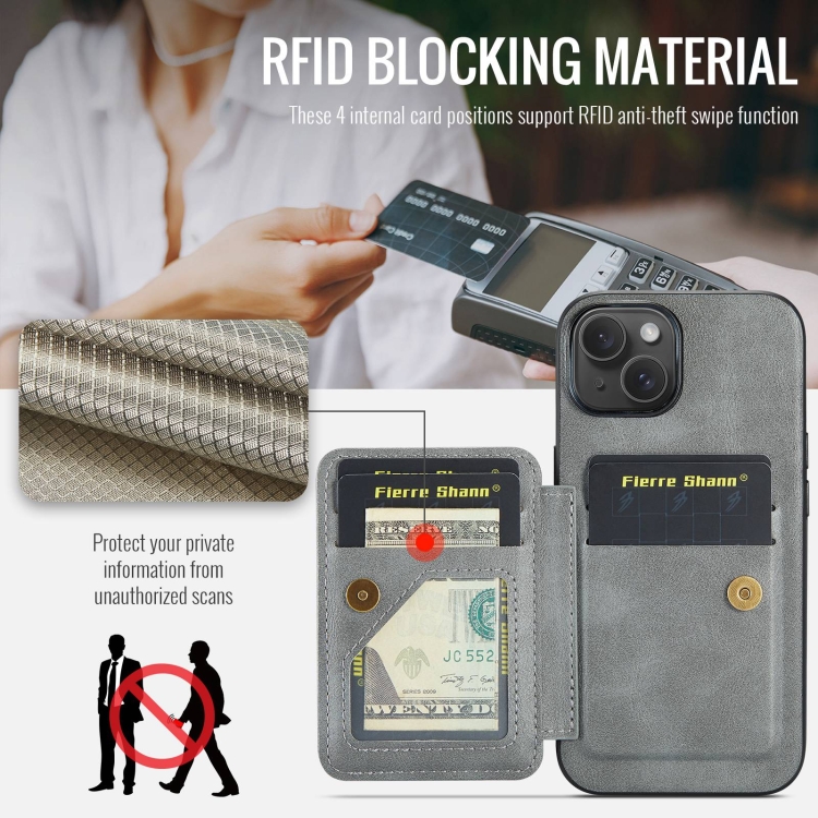 Funda para Teléfono Fierre Shann iPhone 15 Plus Oil Wax con Tarjetero de Cuero de Vaca (Gris)
