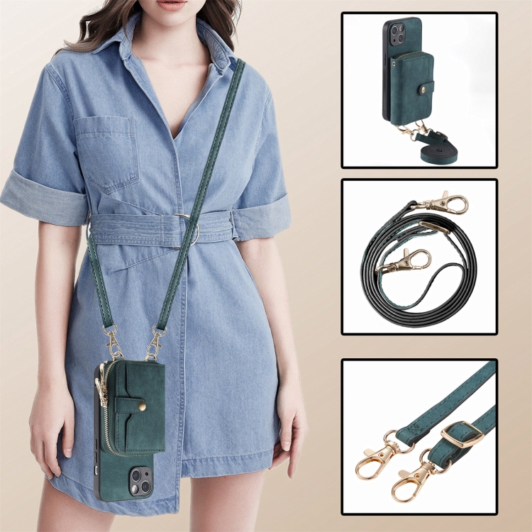 Funda Cruzada para iPhone 15 Plus con Billetera y Cremallera Multifunción (Verde)