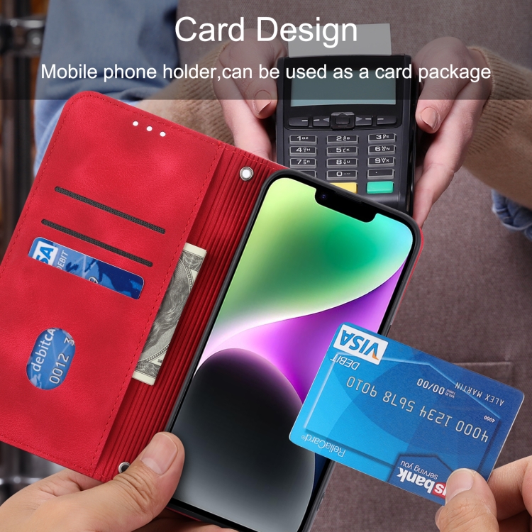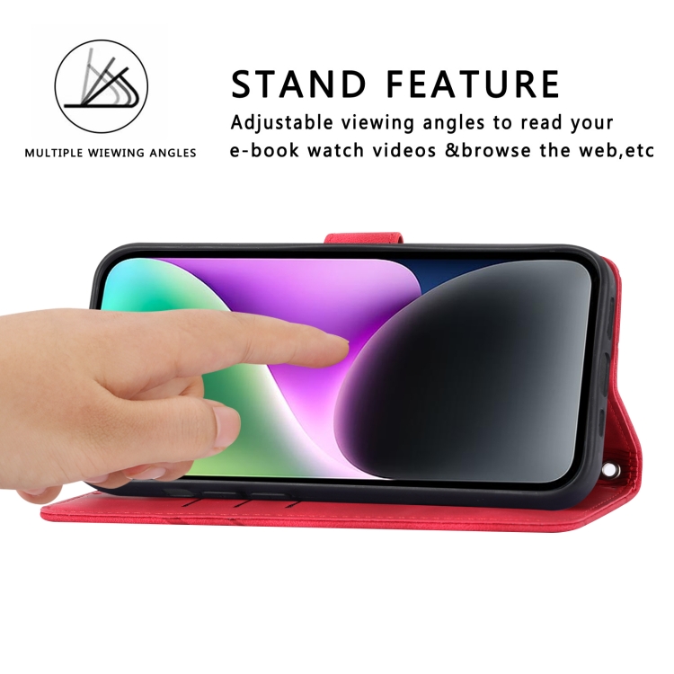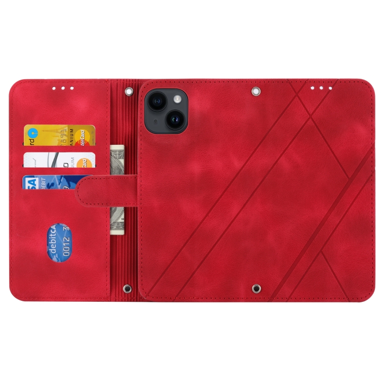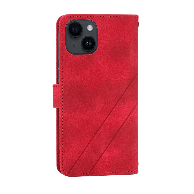 Funda para iPhone 15 Plus Cuero Línea En Relieve y Cordón (Rojo)