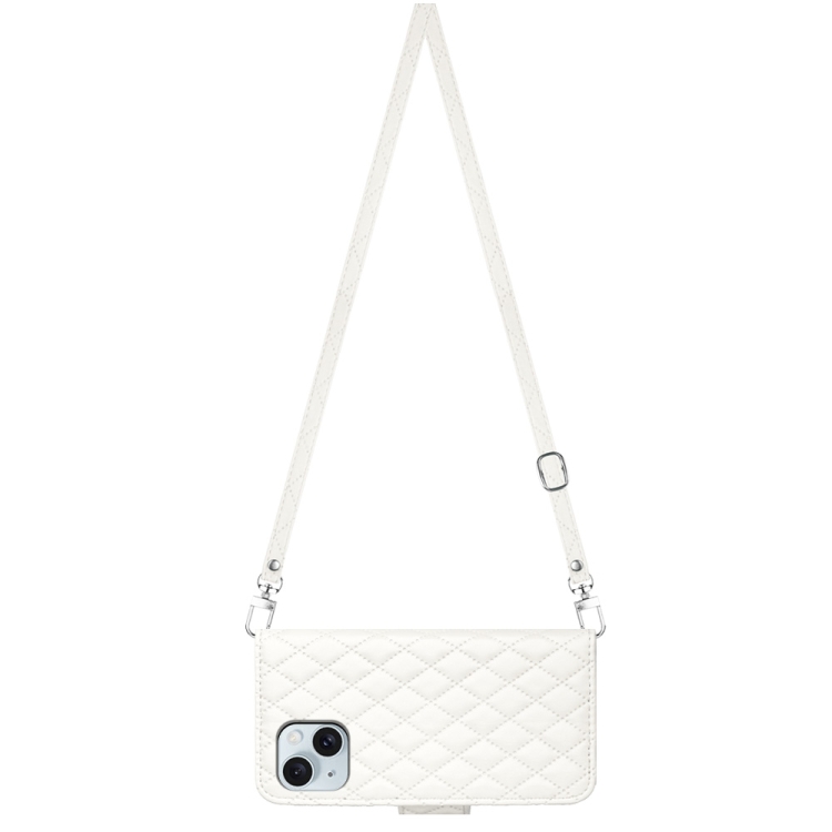 Funda de Cuero para iPhone 15 Plus con Tapa Textura Rómbica y Cordón Largo (Blanco)