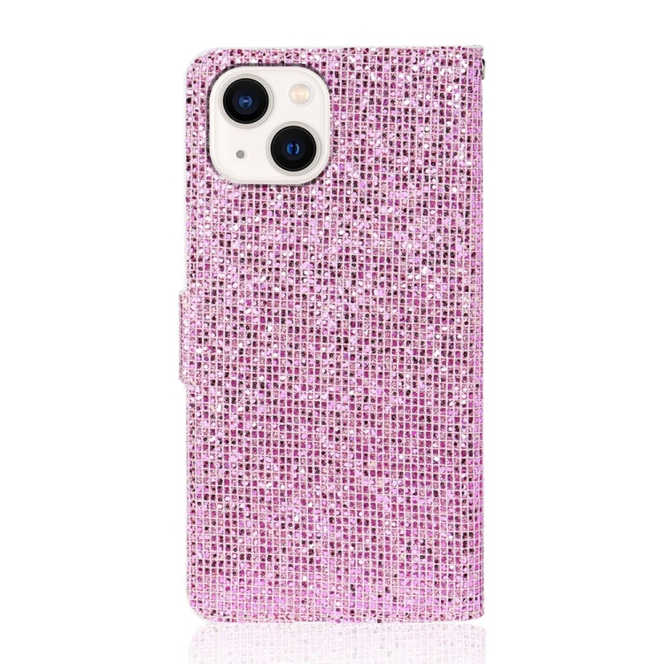 Funda de Cuero para iPhone 15 Plus con Tapa en Polvo con Purpurina (Rosa)