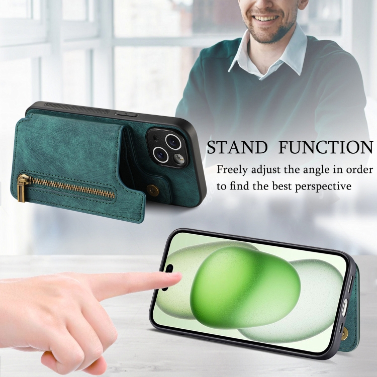 Funda de Cuero Retro para iPhone 15 Plus con Cremallera y Billetera (Verde)