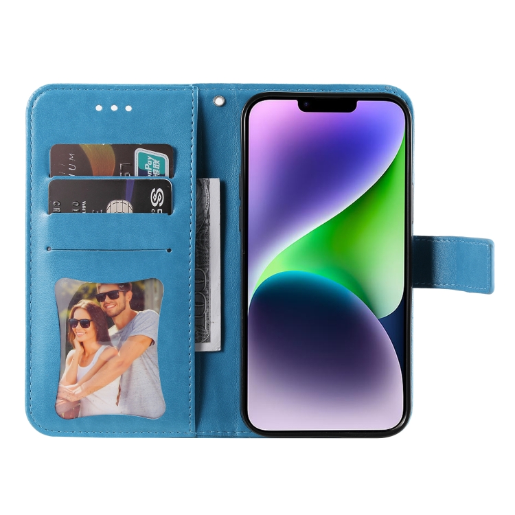 Funda de Teléfono Cuero iPhone 15 Plus Estampado Flores 7 Pétalos (Azul)
