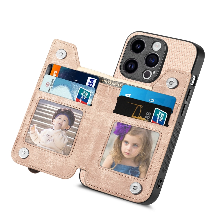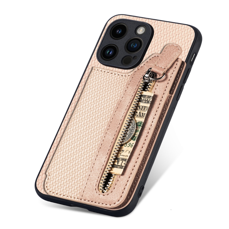 Funda para Teléfono iPhone 15 Plus con Billetera, Cremallera y Tapa Horizontal de Fibra de Carbono (Caqui)