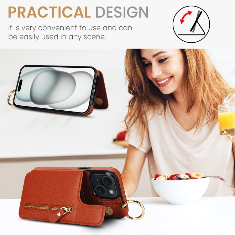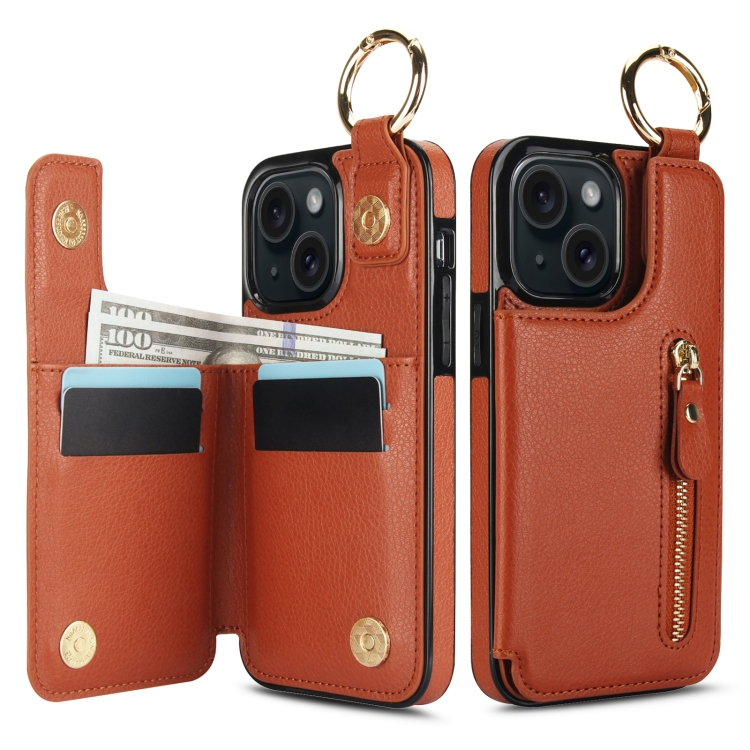 Funda para Teléfono iPhone 15 Plus con Bolsa para Tarjetas Doble Hebilla Cremallera (Marrón)