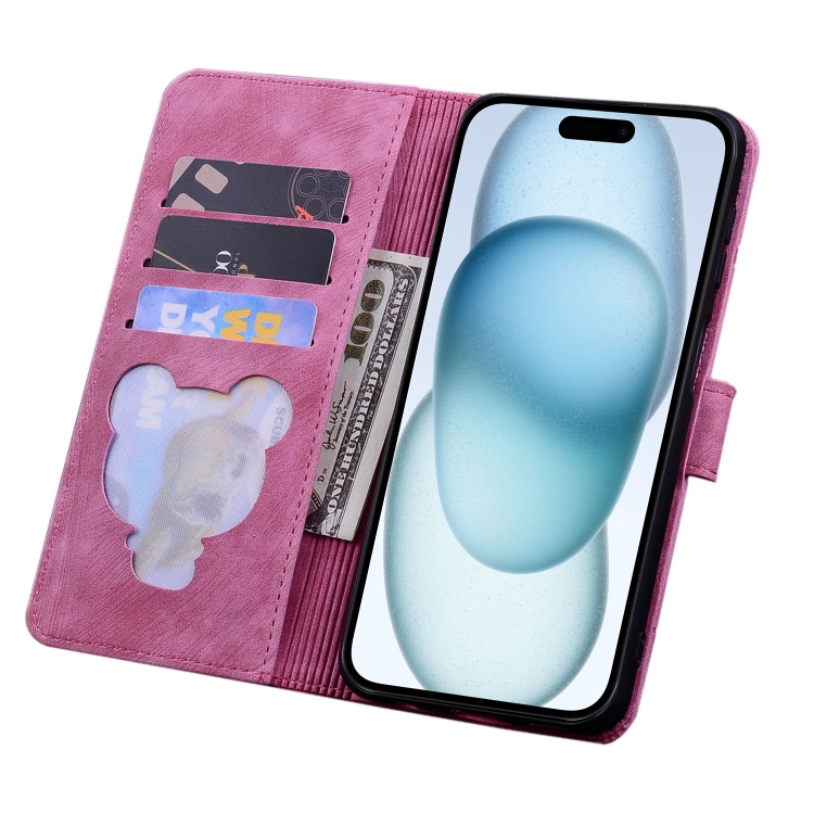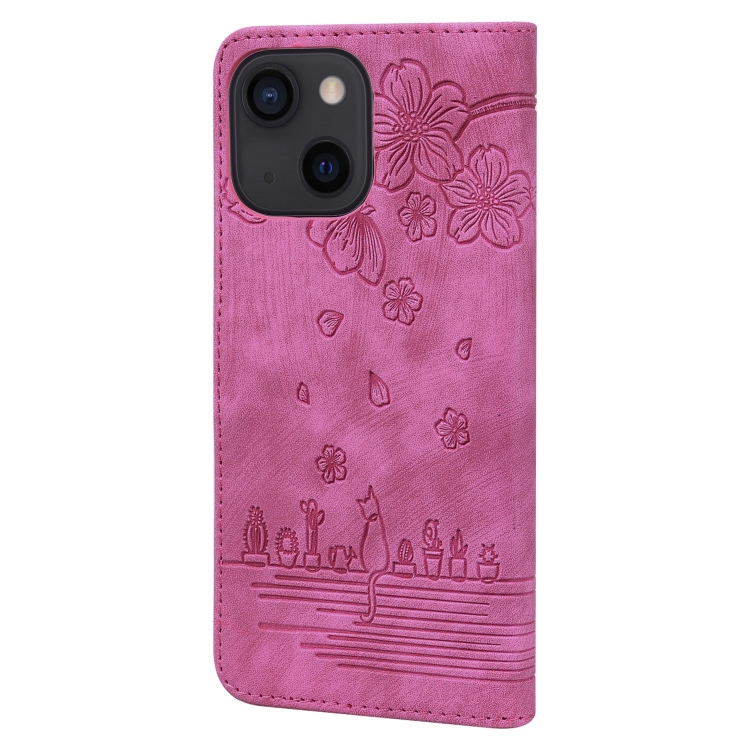 Funda para Teléfono iPhone 15 Plus Cuero Relieve Gato Sakura Dibujos Animados (Rojo Rosa)