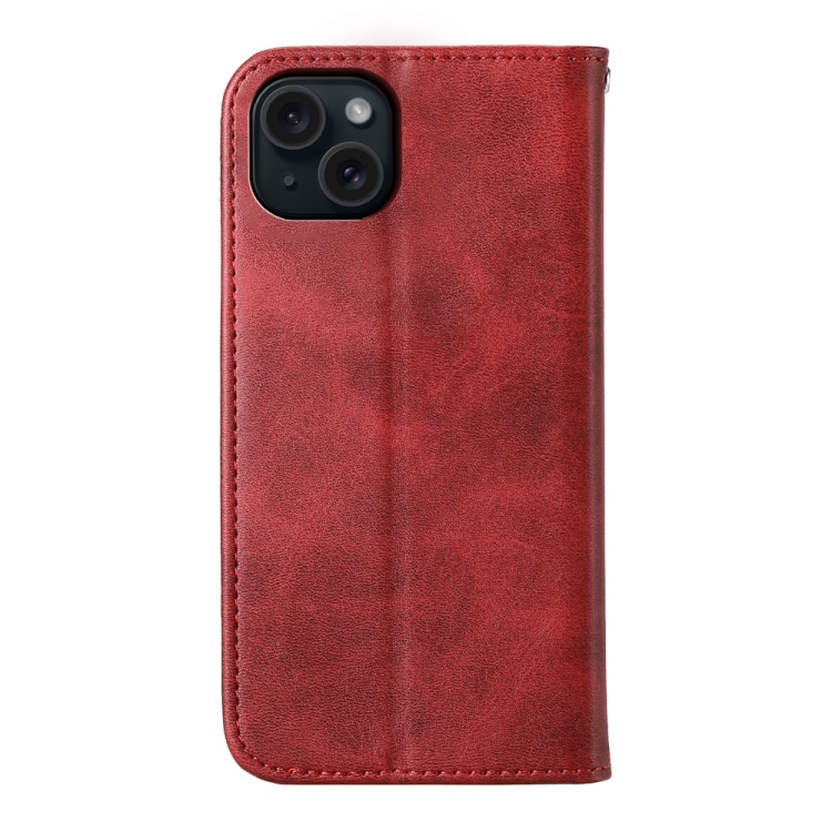 Funda para Teléfono iPhone 15 Plus Cuero Magnético Textura de Becerro Rejilla Cúbica (Rojo)