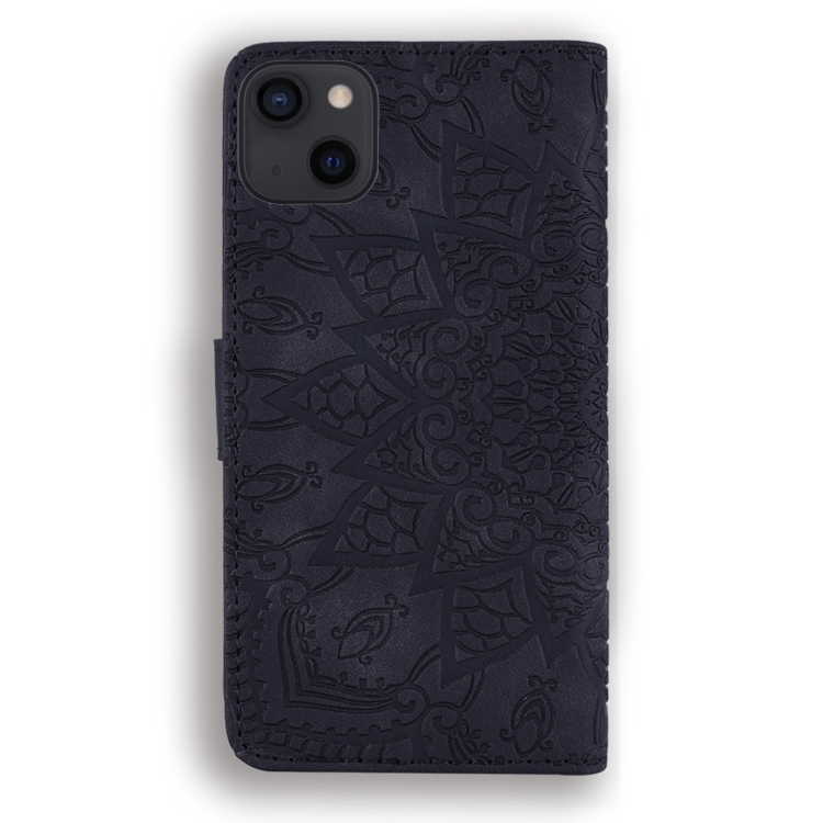 Funda para Teléfono iPhone 15 Plus Piel de Becerro Doble Pliegue Relieve Mandala (Negro)