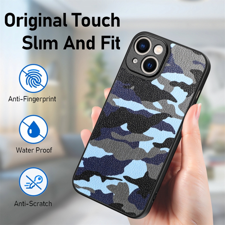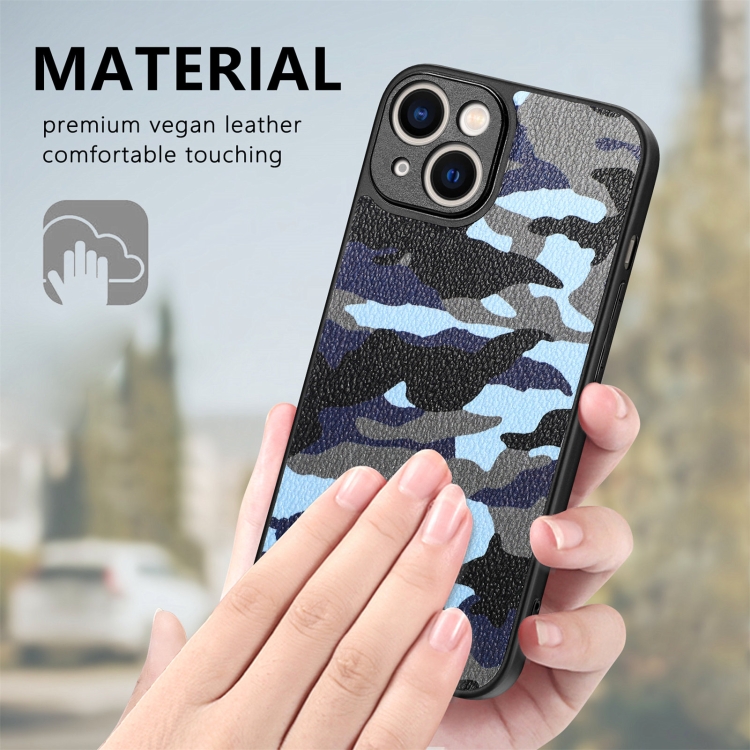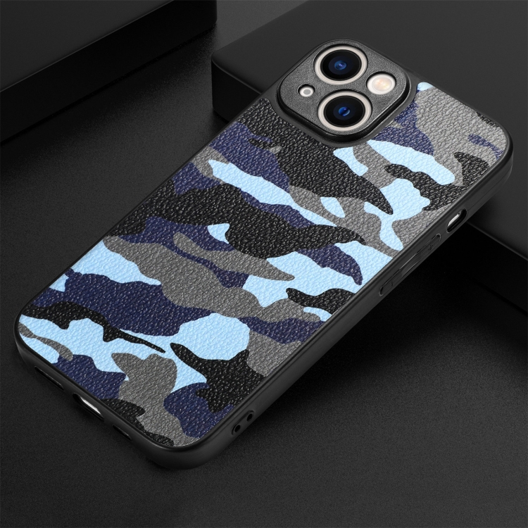 Funda Trasera de Cuero para iPhone 15 Plus Camuflaje Retro (Azul)