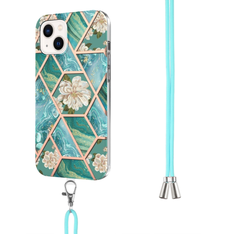 Estuche TPU para iPhone 15 Plus Galvanoplastia Empalme Mármol Patrón de Flores a Prueba de Golpes con Cordón (Flor Azul)