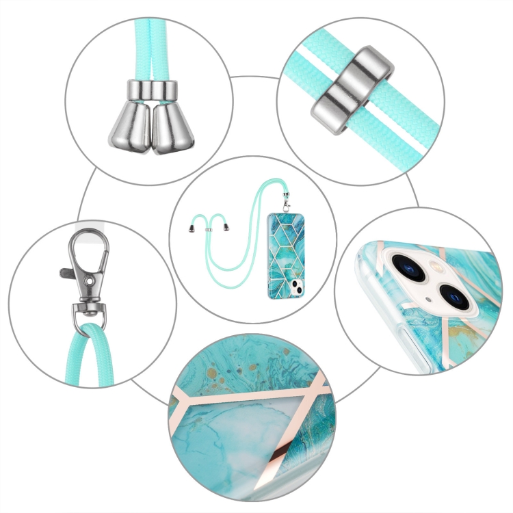 Estuche TPU iPhone 15 Plus Galvanoplastia Empalme Mármol Patrón a Prueba de Golpes con Cordón (Azul)