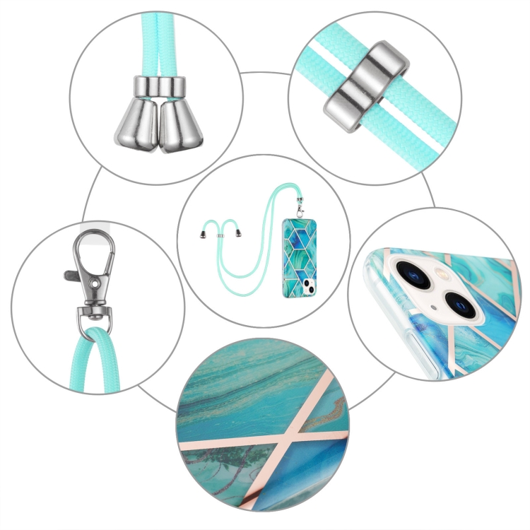Estuche para iPhone 15 Plus TPU Galvanoplastia Empalme Mármol Patrón a Prueba de Golpes con Cordón (Verde)