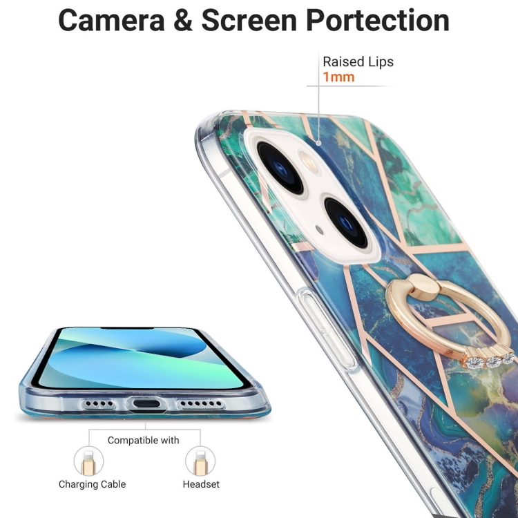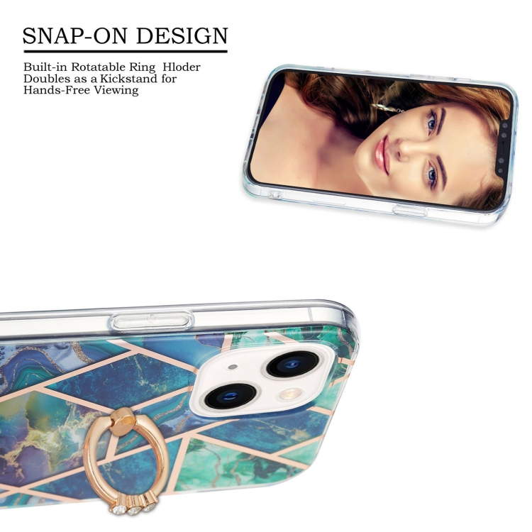 Estuche TPU para iPhone 15 Plus Galvanoplastia Empalme Patrón Mármol con Soporte para Anillo (Azul Verde)