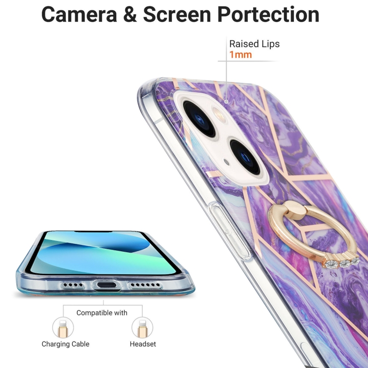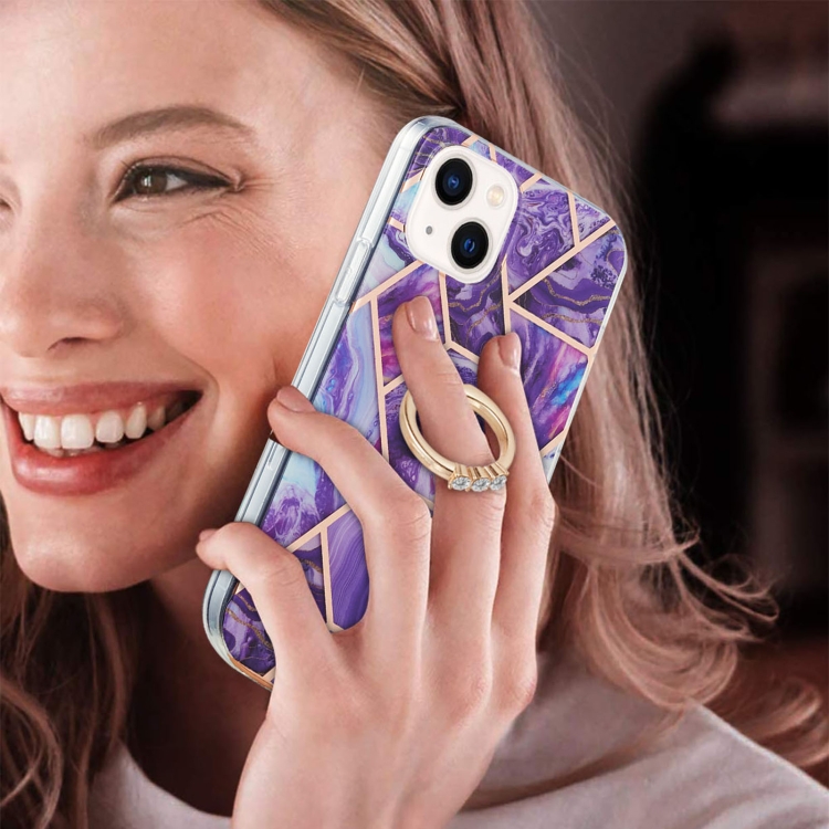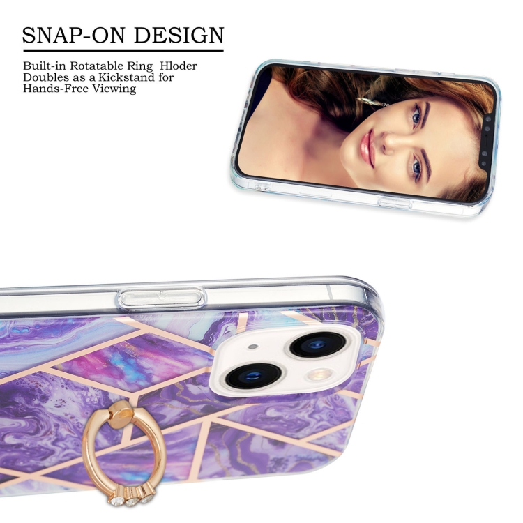 Estuche TPU para iPhone 15 Plus Galvanoplastia Empalme Patrón Mármol Soporte Anillo (Púrpura Oscuro)