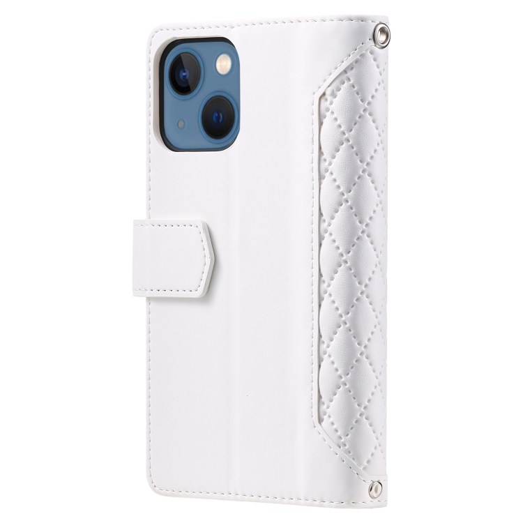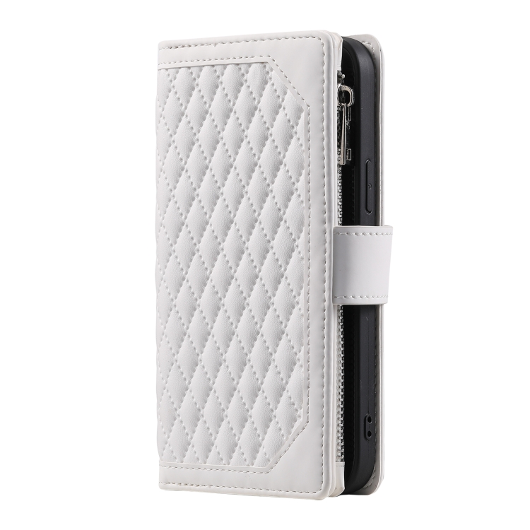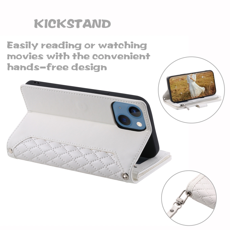 Funda de Cuero para iPhone 15 Plus Grid Texture con Cremallera y Cordón (Blanco)