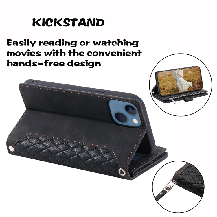 Funda de Cuero para iPhone 15 Plus Grid Texture con Cremallera y Cordón (Negro)