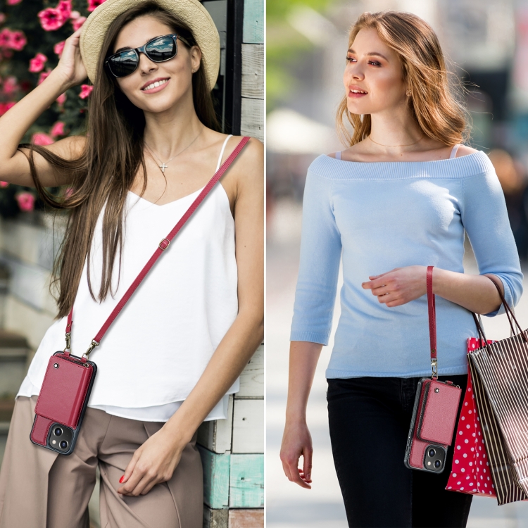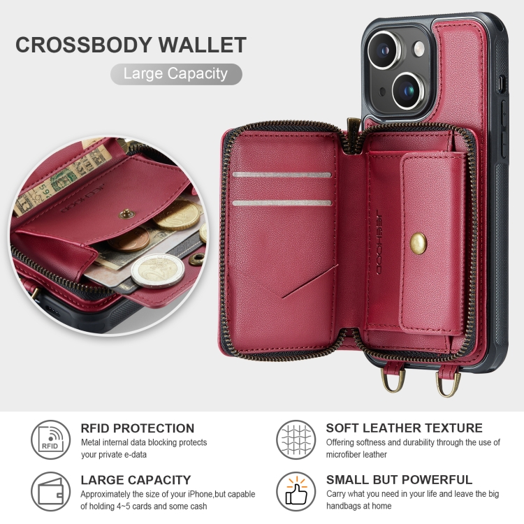 Funda para Teléfono Jeehood C22 iPhone 15 Plus Cuero con Billetera Cremallera y Cordón Doble (Rojo)