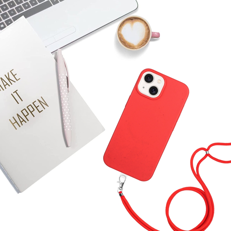 Funda para iPhone 15 Plus Material de Paja Magnético Magsafe de Trigo con Cordón (Rojo)