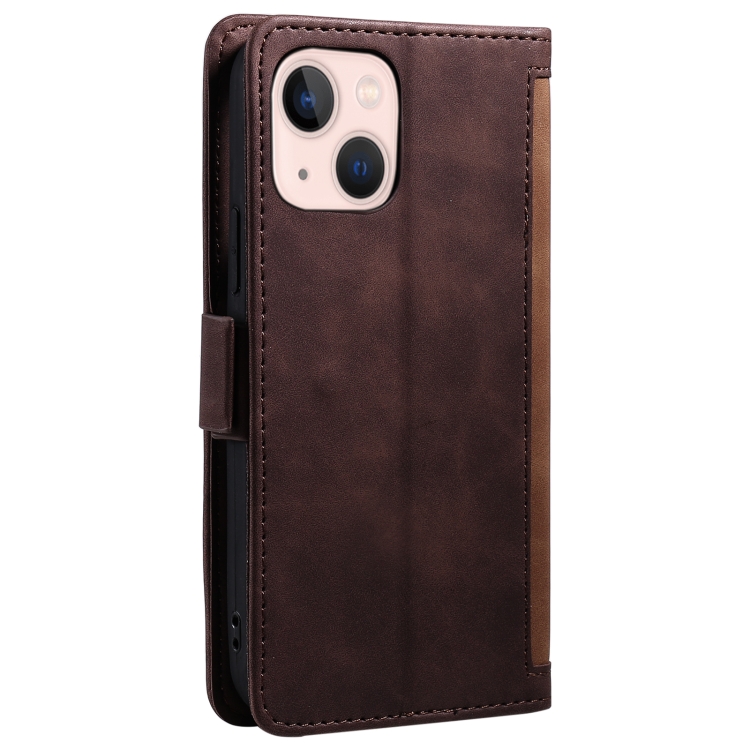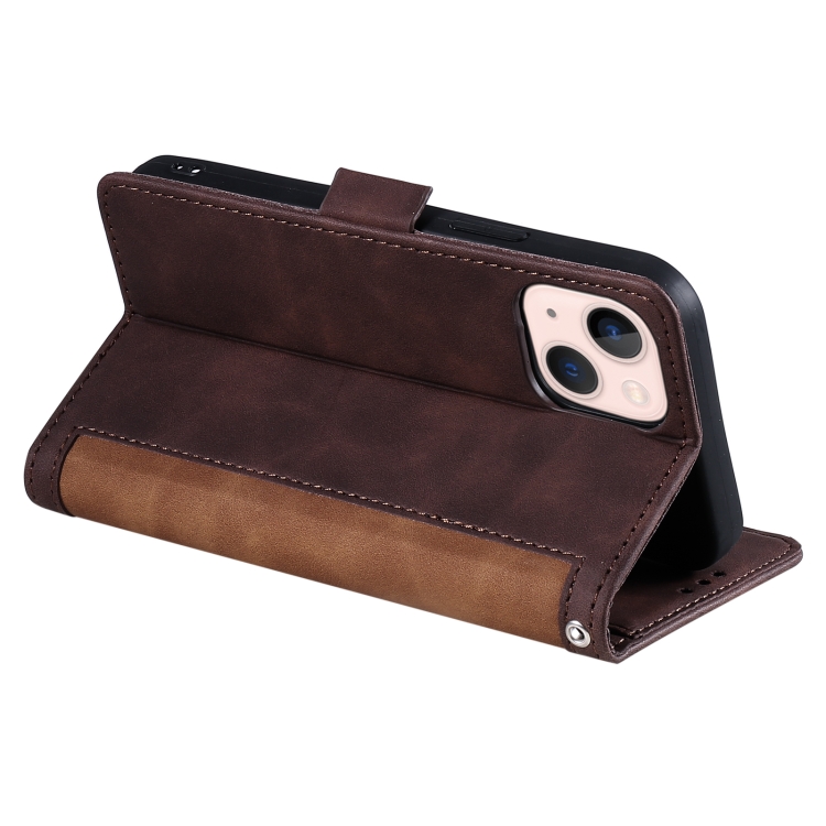 Funda para teléfono iPhone 15 Plus Retro Splicing Horizontal Flip de Cuero (Marrón)