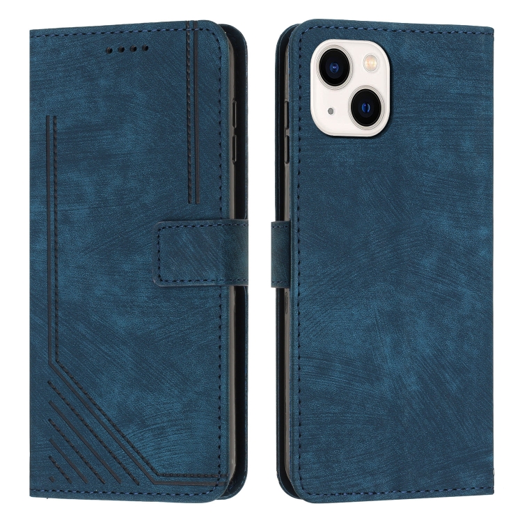 Funda para iPhone 15 Plus Skin Feel Stripe Pattern de Cuero con Cordón (Azul)
