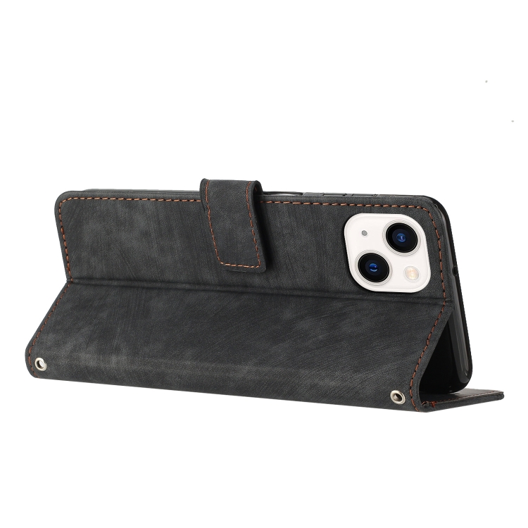 Funda para iPhone 15 Plus Skin Feel Stripe Pattern de Cuero con Cordón (Negro)