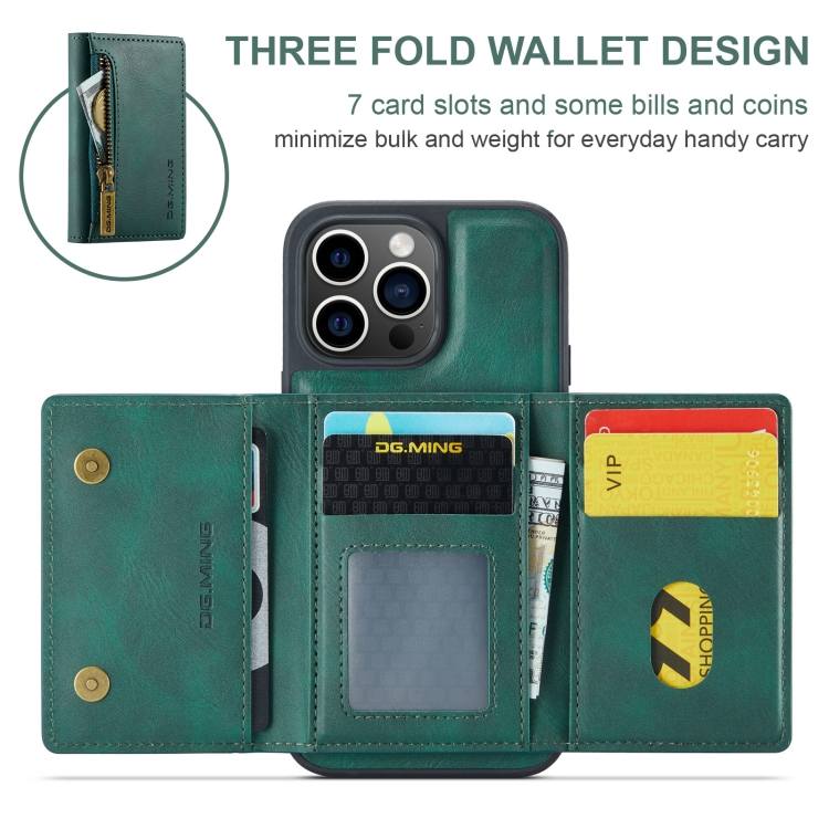 Funda para iPhone 15 Pro Dg.Ming M5 Series Zip RFID Cuero Desmontable con Múltiples Tarjetas (Verde)