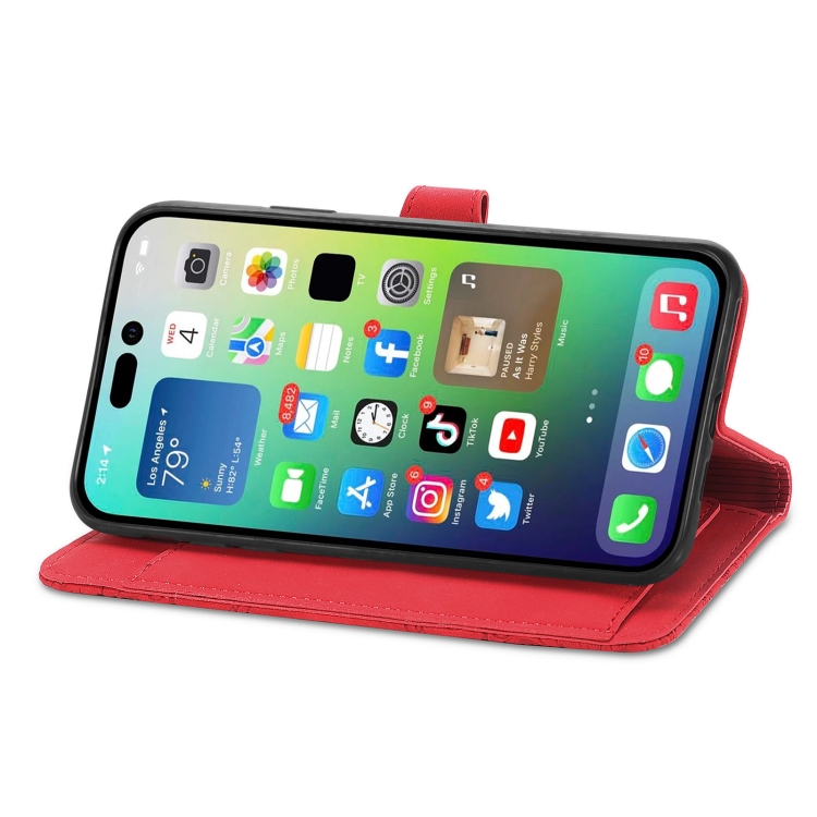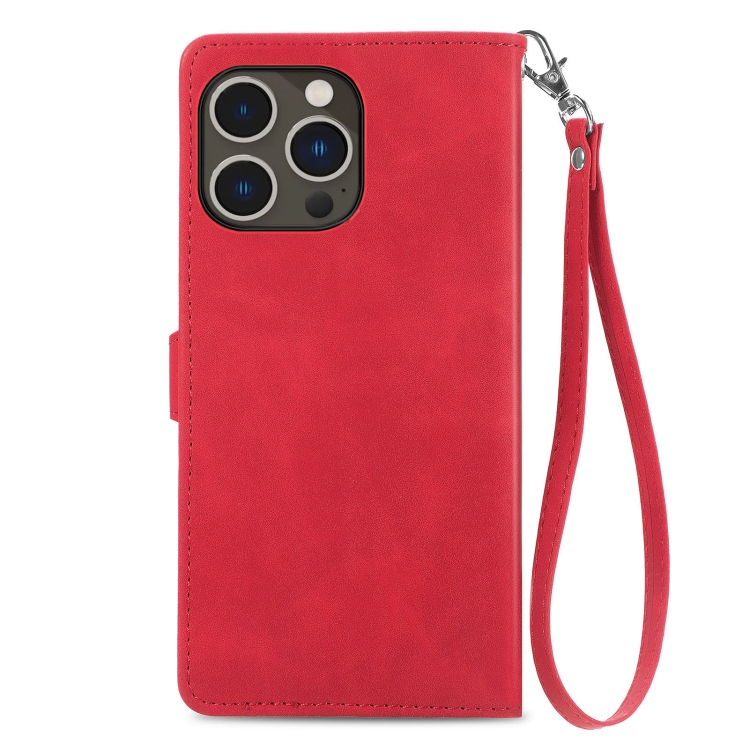 Estuche para Teléfono iPhone 15 Pro Cuero con Cremallera y Flores en Relieve (Rojo)