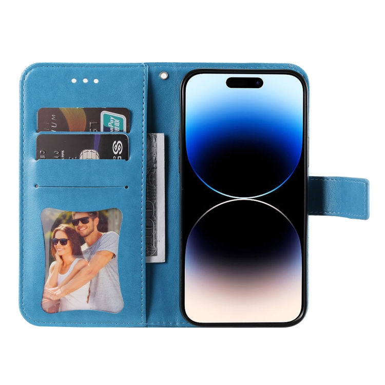 Funda de Teléfono iPhone 15 Pro Cuero Estampado Flores 7 Pétalos (Azul)