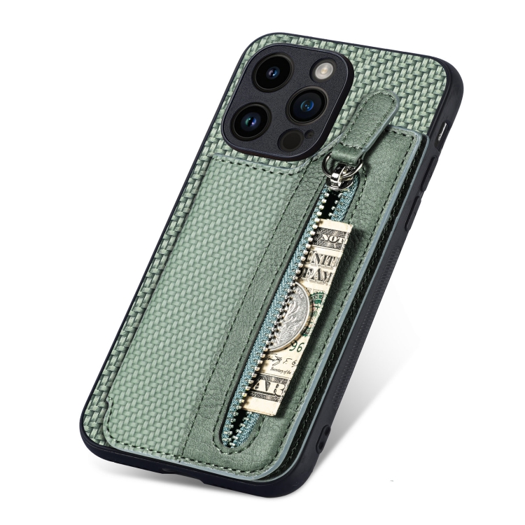 Funda para Teléfono iPhone 15 Pro con Billetera Cremallera Tapa Horizontal Fibra de Carbono (Verde)