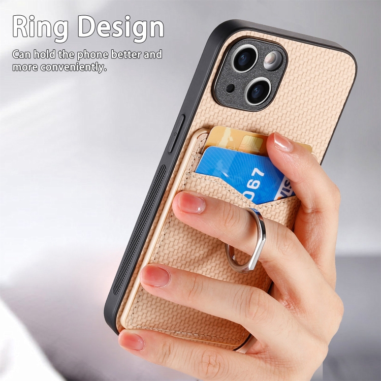 Funda para Teléfono iPhone 15 Pro con Soporte para Anillo y Billetera con Tarjeta de Fibra de Carbono (Caqui)