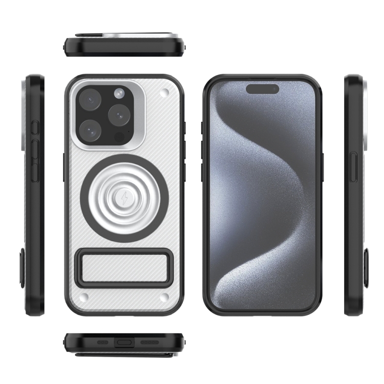 Funda para Teléfono iPhone 15 Pro PC + TPU con Textura de Fibra de Carbono y Soporte de Metal (Blanco)