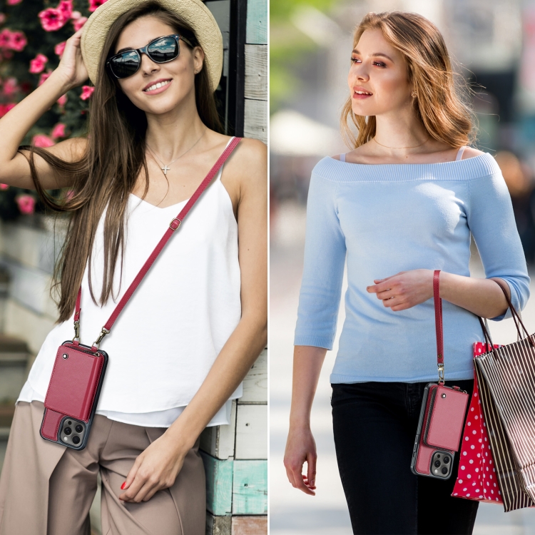 Funda para Teléfono Jeehood C22 Series para iPhone 15 Pro con Billetera, Cremallera y Cordón Doble (Rojo)