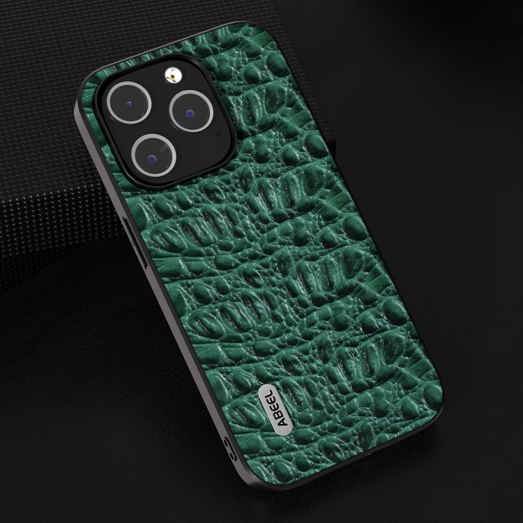 Funda de teléfono Abeel para iPhone 15 Pro Max con borde negro y dosel de cuero genuino (Verde)