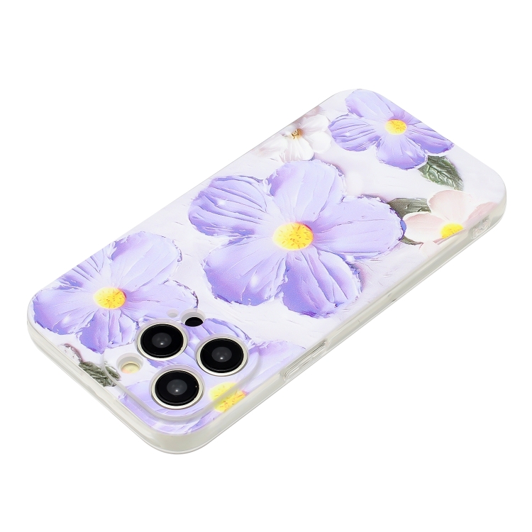 Caja de teléfono TPU para iPhone 15 Pro Max con patrón de pintura colorida (Flores Moradas)