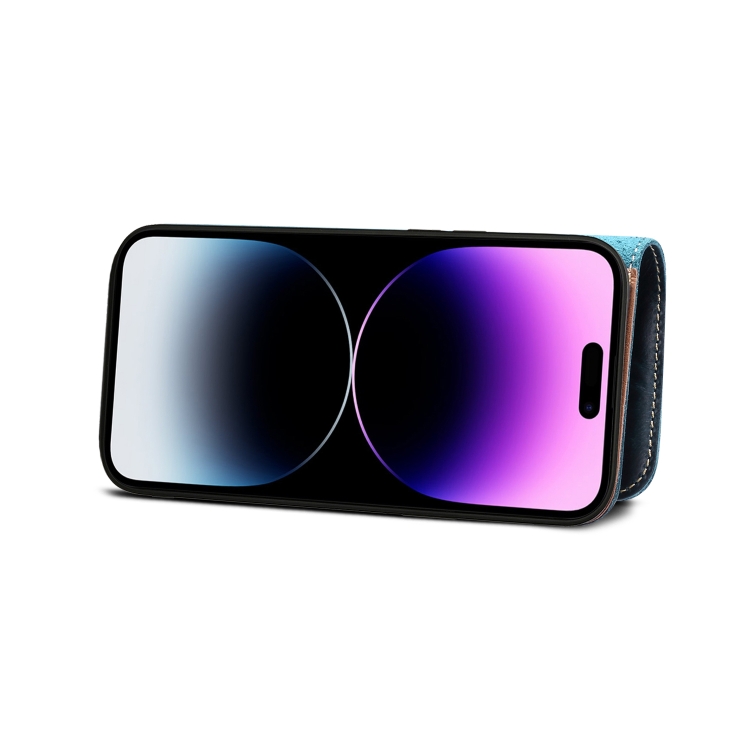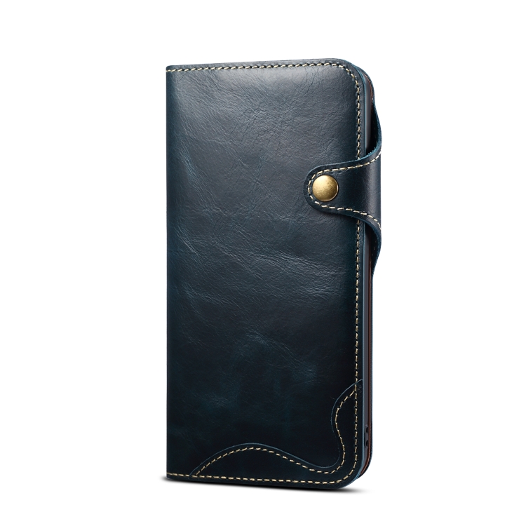 Funda para iPhone 15 Pro Max Denior Oil Wax Cuero de Vaca Botón Magnético (Azul Oscuro)