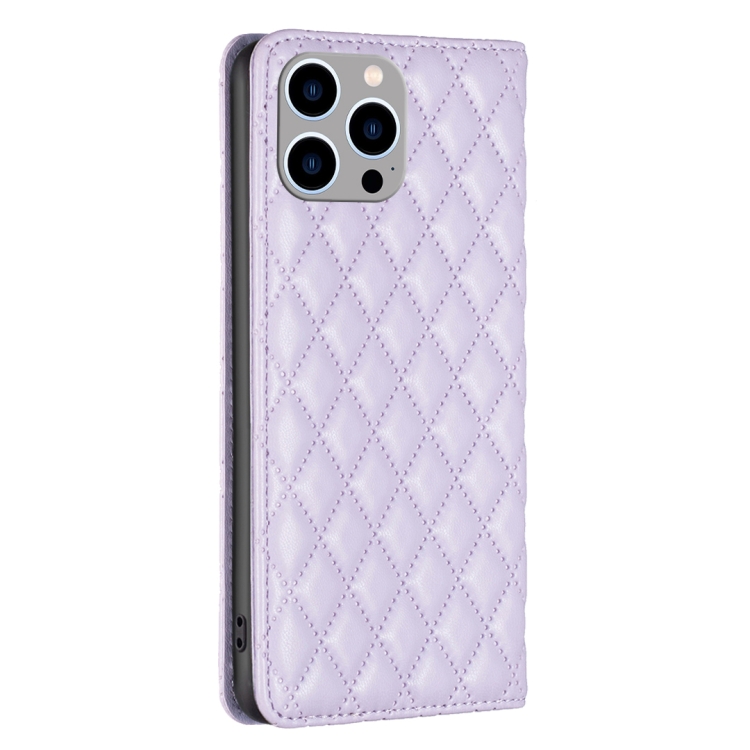 Funda de Teléfono para iPhone 15 Pro Max Diamond Lattice con Tapa de Cuero Magnético (Púrpura)