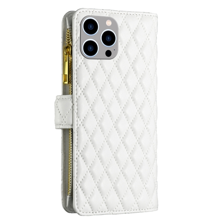 Funda para iPhone 15 Pro Max Diamond Lattice Zipper Wallet de Cuero con Tapa (Blanco)
