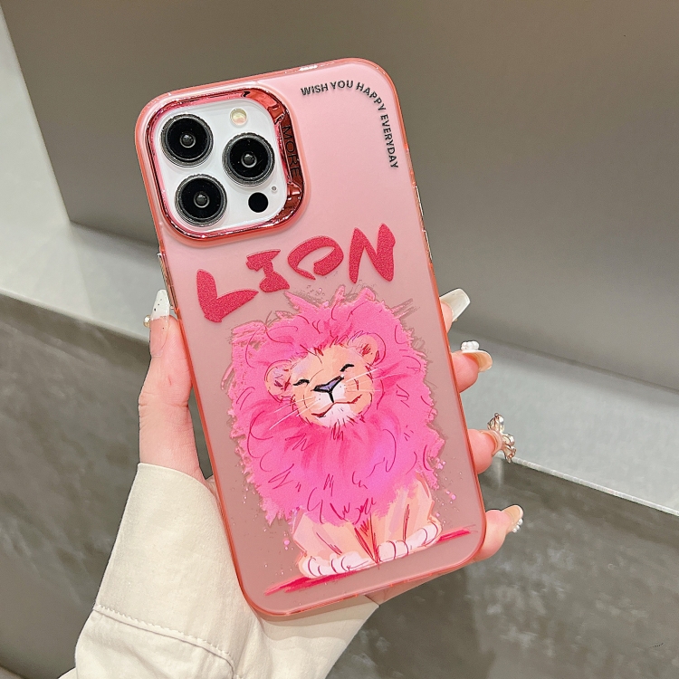 Estuche para teléfono iPhone 15 Pro Max con anillo de Lente galvanizado y diseño de animales dibujos animados (León)