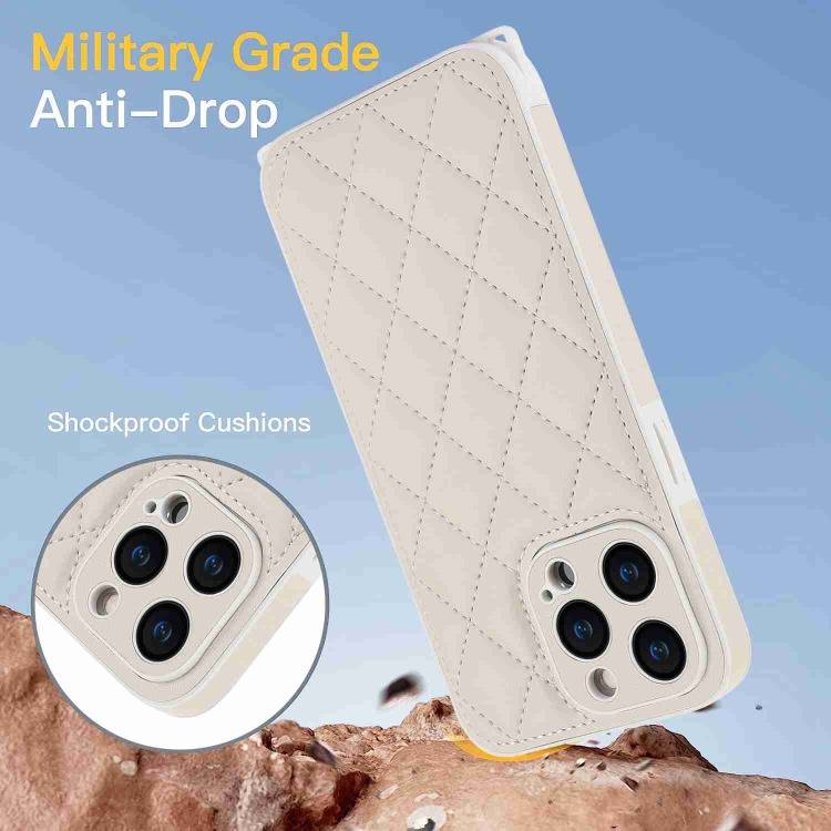 Estuche para teléfono iPhone 15 Pro Max con textura rómbica y cordón doble (Blanco)