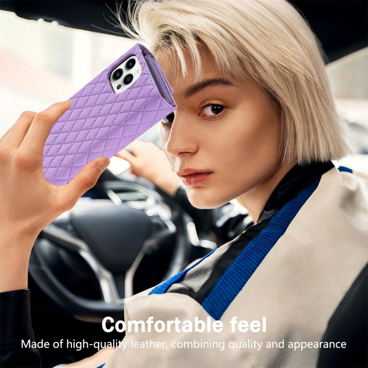 Estuche para Teléfono iPhone 15 Pro Max Cuero Rómbico con Billetera MultiTarjeta y Cremallera (Púrpura)