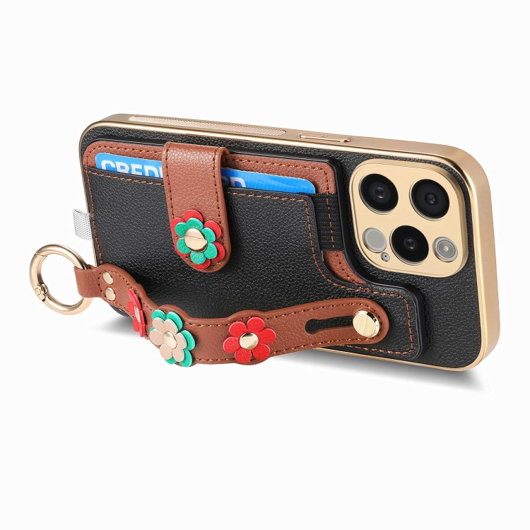 Funda para Teléfono iPhone 15 Pro Max Flores Estereoscópicas Pulsera Bolsa para Tarjeta (Negro)
