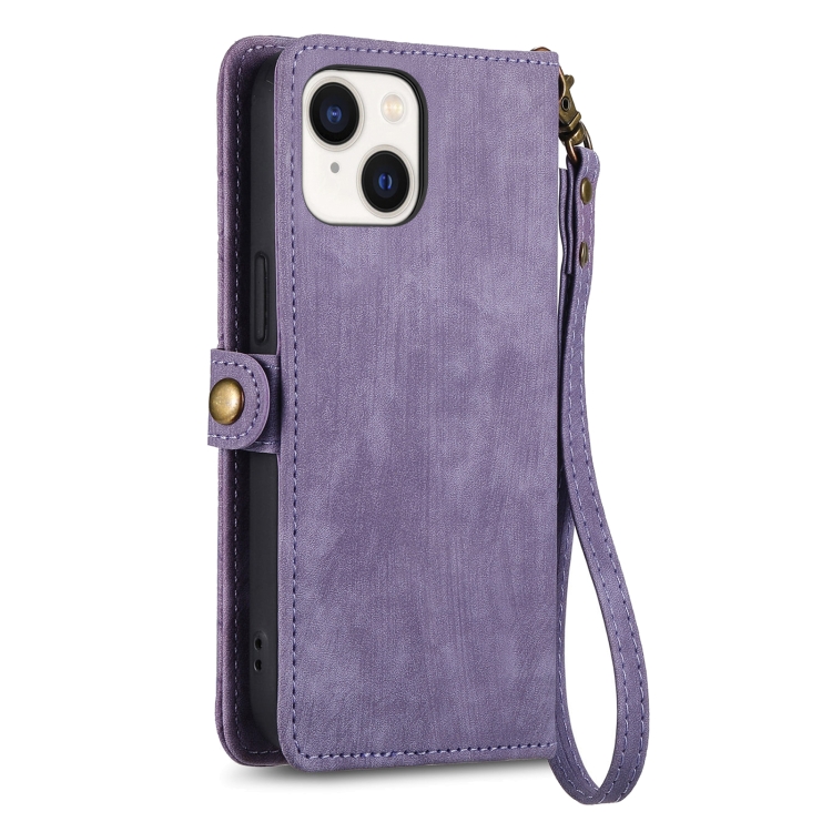 Funda para iPhone 15 Pro Max Cuero con Cremallera Geométrica y Hebilla Lateral (Púrpura)