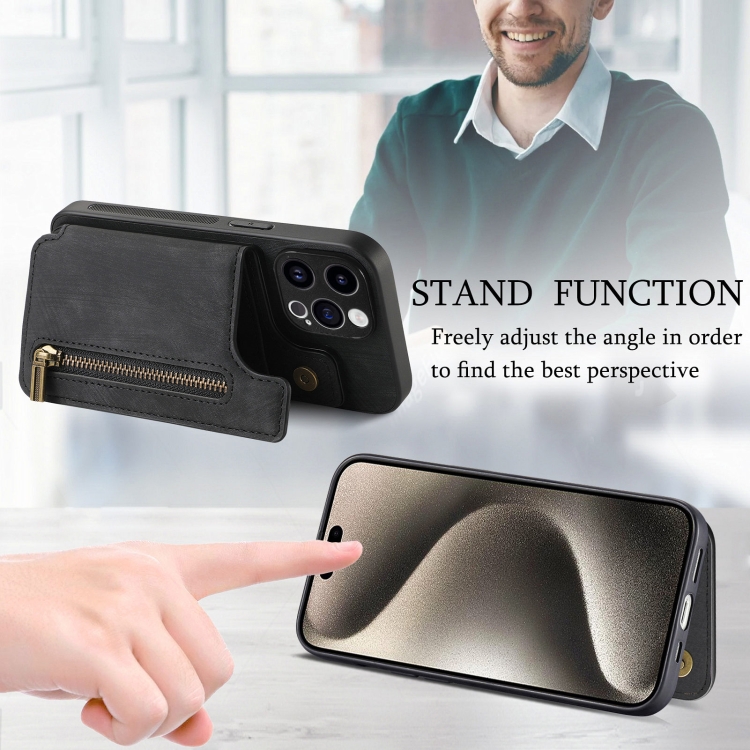 Funda para iPhone 15 Pro Max Cuero Retro con Cremallera y Billetera (Negro)