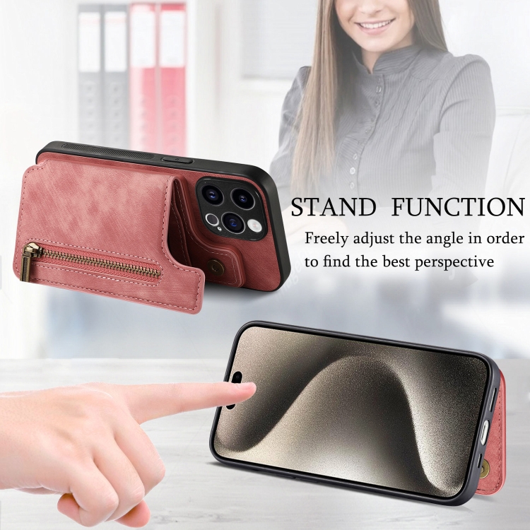 Funda para iPhone 15 Pro Max Cuero Retro con Cremallera y Billetera (Rosa)