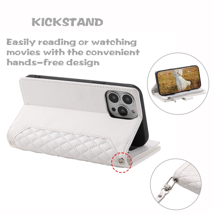 Funda para Teléfono iPhone 15 Pro Max Cuero con Cremallera Textura de Rejilla y Cordón (Blanco)