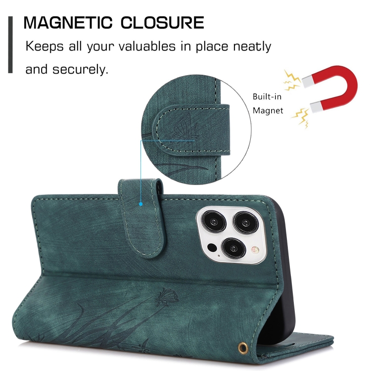 Funda para Teléfono iPhone 15 Pro Max Cuero Relieve Mariposa Orquídea (Verde)