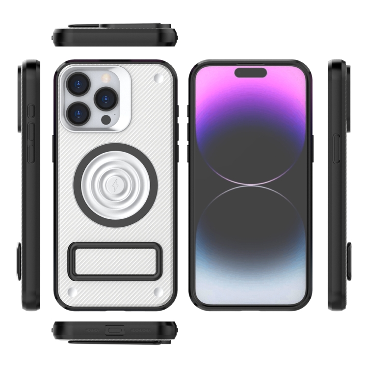 Funda para Teléfono iPhone 15 Pro Max PC + TPU Textura Fibra de Carbono Soporte Metal (Blanco)
